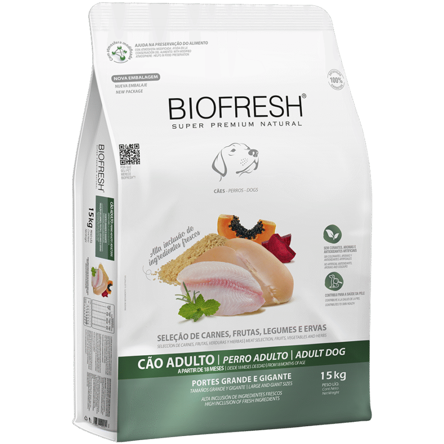 Biofresh Súper Premium para adultos es un alimento que cuida el valor nutritivo de cada uno de sus ingredientes incorporándolos de forma fresca y asegurando una máxima disponibilidad. La alta inclusión de componentes de origen animal, asociado al aporte nutricional de frutas, verduras, legumbres y granos nobles proporciona la dieta ideal para carnívoros facultativos. La adición de ingredientes funcionales asegura una óptima salud, favoreciendo una excelente calidad de piel y pelaje, mantención de un correcto funcionamiento intestinal, estimulación del sistema inmunológico y cuidado de la salud dental, además de la prevención de enfermedades asociadas al paso de los años como la degeneración articular. Biofresh Súper Premium es altamente palatable, diseñado para perros adultos de raza grande, adaptado a sus requerimientos nutricionales.